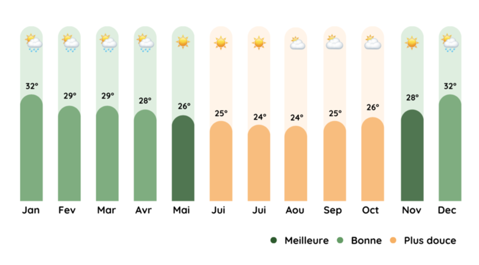 Si vous rêvez de vacances ensoleillées, la meilleure période pour y aller est de mai à octobre, qui correspond à l’hiver austral. Pendant ces mois, vous profiterez de températures agréables, entre 20°C et 25°C, avec peu de pluie, parfait pour explorer les plages et profiter des activités en plein air. Si vous préférez la chaleur, la saison estivale de novembre à avril est également une option, bien qu’elle soit plus humide. En résumé, pour un soleil éclatant et un temps sec, optez pour l’hiver austral ! 🌞🏖️